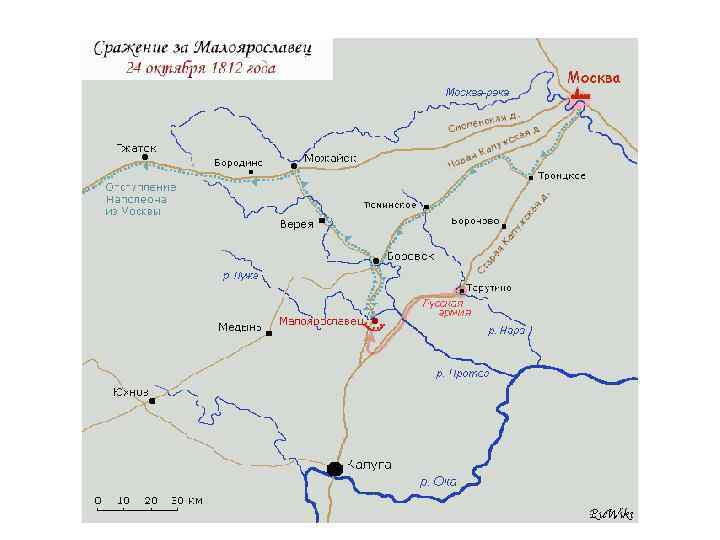7 октября Наполеон выступил из Москвы и двинулся на Калугу. Планы Наполеона: овладеть Калугой, ее продскладами, двинуться в южные губернии России, потом свернуть к Смоленску, где располагались военные, продовольственные, фуражные склады. Ключевым 12 октября пунктом – стал сражение г. Малоярославец. под Малоярославцем. 8 раз город переход из рук в руки. Этот бой стал поворотным в ходе войны: Кутузов заслонил Калужскую дорогу и заставил Наполеона двигаться по разоренной Смоленской дороге. Колоны неприятеля двигались в беспорядке. Пехота, кавалерия, артиллерия, обоз - все смешалось, что сделало французов более уязвимым для армии и отрядов партизан.