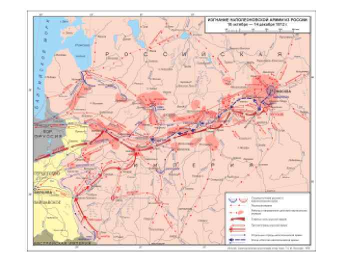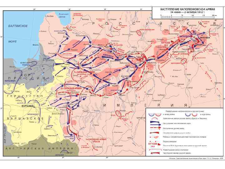 Основные события: 12 июня — главные силы французов начали переправу через Неман Ø Ø 22 июля — 1 -я и 2 -я русские армии соединились под Смоленском Ø 4 — 6 августа — состоялась битва за Смоленск между войсками Барклая-де. Толли и основными силами Наполеона. Русские оставили Смоленск Ø 24 августа — состоялся бой войск генерал-лейтенанта М. Д. Горчакова с основными силами Наполеона за Шевардино Ø 26 августа — произошло Бородинское сражение. Потери обеих сторон были огромны. Кутузов дал приказ отступать Ø 1 сентября — на совете в Филях Кутузов принял решение оставить Москву без боя, дабы сохранить армию Ø 16 сентября — партизанский отряд полковника Д. В. Давыдова нанес поражение неприятельскому подразделению у Вязьмы Ø 18 октября — русские войска вступили в Тарутинский лагерь. С этого момента началась партизанская война Ø 12 октября — состоялся бой за Малоярославец Ø 27 октября — Наполеон вступил в Смоленск Ø 23 ноября — Наполеон бросил остатки своей армии и бежал во Францию Ø 14 -16 ноября – переход через Березину