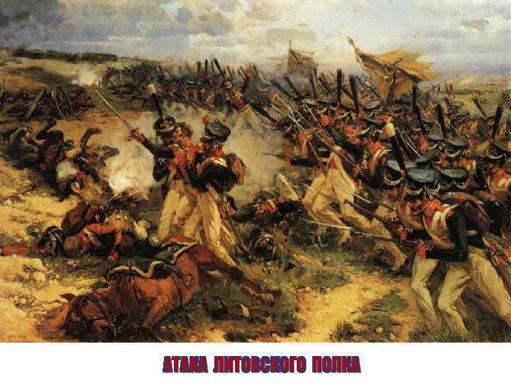 ПРИЧИНЫ ПОБЕДЫ РОССИИ 1. Отечественный характер войны, который проявлялся: – в стойкости российских солдат и офицеров; – в развертывании партизанского движения; – во всенародном патриотическом подъеме. 2. Высокий уровень русского военного искусства. 3. Значительный экономический потенциал России. 4. Моральное перерождение Великой армии. 5. Наполеон не освободил крестьян от крепостничества. 6. Англия и Испания отвлекли силы Наполеона. 7. Огромные размеры и климат России.