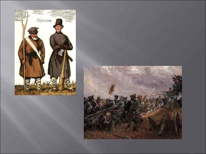 Командиры крестьянских отрядов в войну 1812 года Герасим Курин Василиса Кожина Дух русского народа не был сломлен и на привале всегда звучали песни и весёлые шутки, поддерживавшие народные массы в их борьбе.