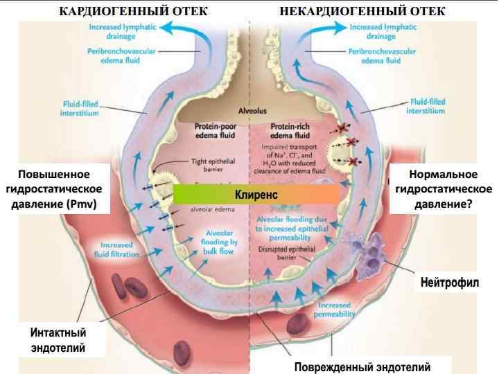 Физиология «Тонкая» (газообмен) и «толстая» (обмен жидкости) стороны альвеолокапиллярной мембраны. Первичное накопление жидкости происходит в пределах толстой стороны, опережая нарушения газообмена