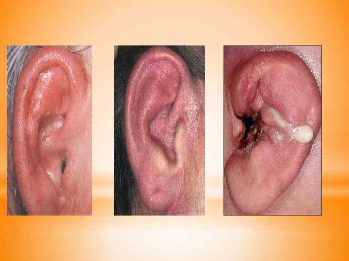 Наружный отит Существуют 2 формы наружных отитов: 1. Ограниченная 2. Диффузная 1. Ограниченный наружный отит проявляется как воспаление (абсцесс) тканей наружного уха в виде фурункулов или карбункулов, связанных с инфекционным поражением волосяных мешочков и сальных желез в перепончато-хрящевой части наружного слухового прохода, а также локальных нарывов, возникающих в результате травмирующих воздействий. Основным патогеном при абсцессе является золотистый стафилококк. 2. Диффузный отит характеризуется обширным поражением покровов наружного слухового прохода, а часто и барабанной перепонки. Как правило, возникает в результате попадания в ухо воды (особенно загрязнённой), которая разжижает ушной секрет и, вкупе с высокой влажностью, создаёт благоприятные условия для развития патогенных бактерий (в основном синегнойной палочки), в связи с чем данный синдром часто называют как «ухо пловца» .