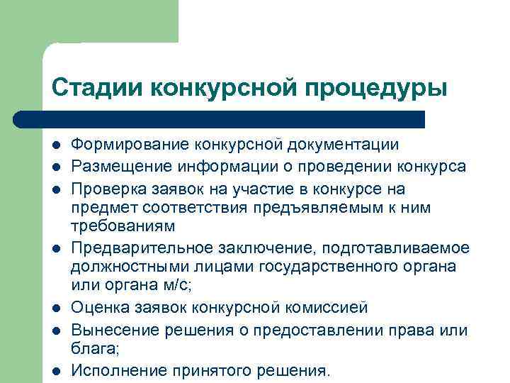 Стадии конкурсной процедуры l l l l Формирование конкурсной документации Размещение информации о проведении конкурса Проверка заявок на участие в конкурсе на предмет соответствия предъявляемым к ним требованиям Предварительное заключение, подготавливаемое должностными лицами государственного органа или органа м/с; Оценка заявок конкурсной комиссией Вынесение решения о предоставлении права или блага; Исполнение принятого решения.