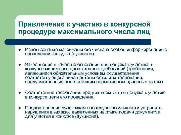 Привлечение к участию в конкурсной процедуре максимального числа лиц l Использование максимального числа способов информирования о проведении конкурса (аукциона). l Закрепление в качестве основания для допуска к участию в конкурсе минимально достаточных требований (требования, являющиеся обязательным условием осуществления соответствующего вида деятельности, или требования, предусмотренные вышестоящим нормативным правовым актом) l Соответствие требований, предъявляемых для допуска к участию в конкурсе цели его проведения. l Предоставление участникам процедуры возможности устранить нарушения в заявках, выявленных на этапе подачи документов для участия в конкурсе (аукционе).