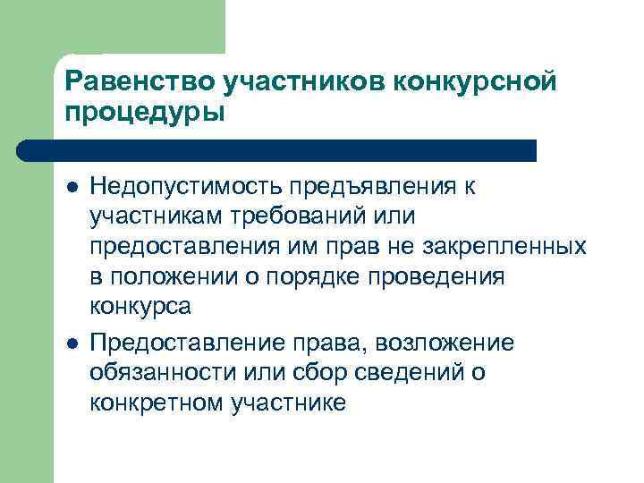 Равенство участников конкурсной процедуры l l Недопустимость предъявления к участникам требований или предоставления им прав не закрепленных в положении о порядке проведения конкурса Предоставление права, возложение обязанности или сбор сведений о конкретном участнике