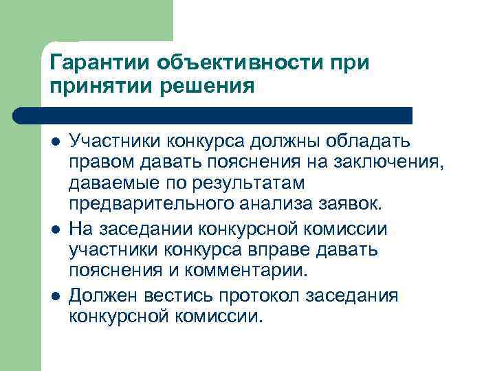 Гарантии объективности принятии решения l l l Участники конкурса должны обладать правом давать пояснения на заключения, даваемые по результатам предварительного анализа заявок. На заседании конкурсной комиссии участники конкурса вправе давать пояснения и комментарии. Должен вестись протокол заседания конкурсной комиссии.