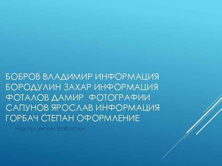 БОБРОВ ВЛАДИМИР ИНФОРМАЦИЯ БОРОДУЛИН ЗАХАР ИНФОРМАЦИЯ ФОТАЛОВ ДАМИР ФОТОГРАФИИ САПУНОВ ЯРОСЛАВ ИНФОРМАЦИЯ ГОРБАЧ СТЕПАН ОФОРМЛЕНИЕ Над проектом работали
