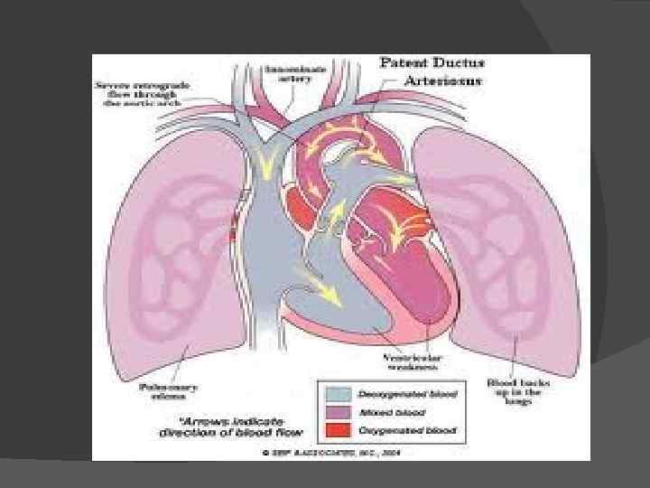 В результате правый желудочек компенсаторно гипертрофируется и расширяется. Расширяется и легочная артерия, которая наполняется кровью под большим давлением. Таким образом, артериальная кровь добавляется к венозной, следовательно, возникает сброс слева направо. Количество сбрасываемой крови различно в зависимости от соотношения диаметров протока и аорты.
