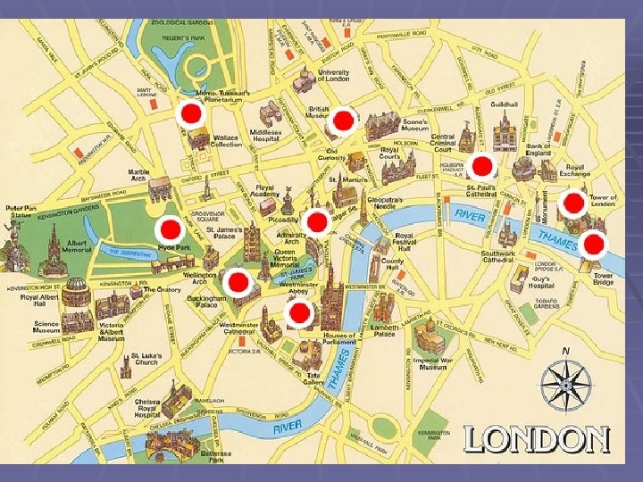 Sights of London § § § § § § § § Цели урока: развитие языковой компетенции учащихся через обобщение знаний по теме “Лондон и его достопримечательности”. Задачи урока: Социокультурный аспект – знакомство с достопримечательностями Лондона; Развивающий аспект – развитие способности осуществлять продуктивные и речевые действия; Воспитательный аспект – воспитание уважительного отношения к иноязычной культуре; Учебный аспект – совершенствование лексических навыков говорения в виде монологической и диалогической речи, развитие навыков аудирования и чтения. Оснащение урока: Учебник “English 5 кл Students Book. ” В. П. Кузовлев. Учебник “English 5 кл Students Book. ” В. П. Кузовлев. Книга для учителя к учебнику “Enjoy English 5 -6 класс” Диск к учебнику “Enjoy English 5 -6 класс” Биболетовой М. З. Компьютер; Презентация программы “ Power Point”; Текст для чтения; Обобщающий тест. Ход урока 1. Организационный момент. Teacher (T): Good morning, children. I am glad to see you. I think you are ready to begin the lesson. At the lesson we’ll speak about this topic. What is it? We’ll try to guess but now let’s do the task guess but now let’s do the 2. Фонетическая зарядка (ex. 17, p. 17). Fist listen to the tape recorder and repeat. 3. Речевая зарядка. T: Did you guess the topic of our lesson? I think you did. Today we’ll speak about London’s places of interest. But it is necessary for me to understand what do you thing T: Did you guess the topic of our lesson? I think you did. Today we’ll speak about London’s places of interest. But it is necessary for me to understand what do you thing about these. 1. What places of interest do you know? 2. Would you like to visit London? Why? 4. Развитие навыков аудирования. T: I see. We are going to travel together. But it is necessary for us to find the places that we want to visit. Now you’ll see the sights of London But before we’ll try to guess. What is it? (Приложение 1) It is the famous clock. It is real bell. You can hear its deep tone on the BBC. People say that it is a face of London. P 1: I think it is Big Ben. T: You are right. Let’s see this place. It’s the home of the British royal family in London. Outside the palace we can watch a colorful ceremony of the Changing of the Guard. P 2: I think it is Buckingham Palace. T: You are right. T: You are right. The buildings in which the British parliament sits. P 3: This is the Houses of Parliament. P 3: This is the Houses of Parliament. T: You are right. T: You are right. It is the best-known bridge. It was built in 1897. This bridge is across the Thames.