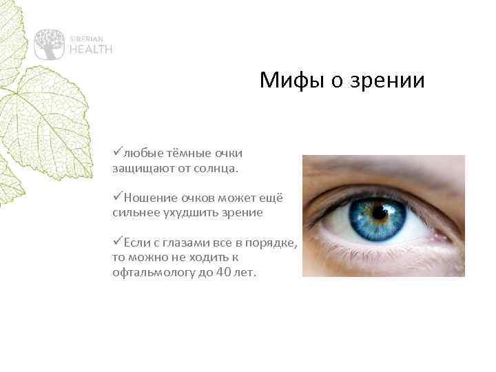 Мифы о зрении üлюбые тёмные очки защищают от солнца. üНошение очков может ещё сильнее ухудшить зрение üЕсли с глазами все в порядке, то можно не ходить к офтальмологу до 40 лет.