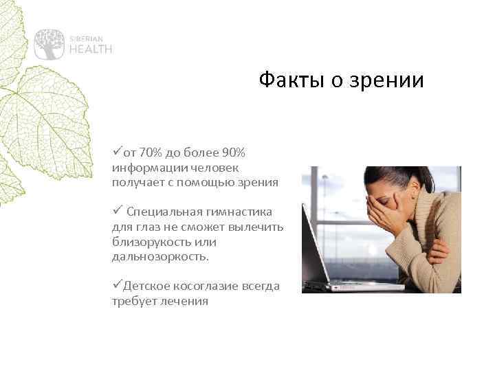 Факты о зрении üот 70% до более 90% информации человек получает с помощью зрения ü Специальная гимнастика для глаз не сможет вылечить близорукость или дальнозоркость. üДетское косоглазие всегда требует лечения