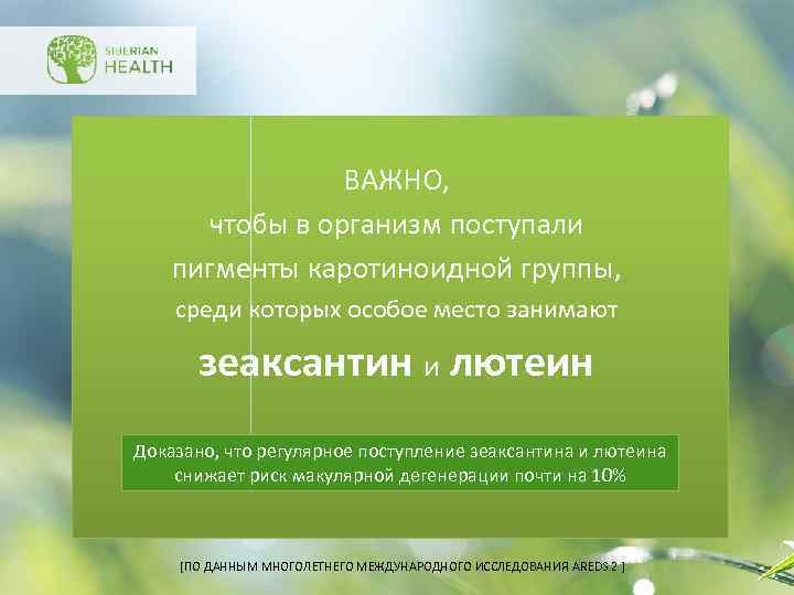 ВАЖНО, чтобы в организм поступали пигменты каротиноидной группы, среди которых особое место занимают зеаксантин и лютеин Доказано, что регулярное поступление зеаксантина и лютеина снижает риск макулярной дегенерации почти на 10% [ПО ДАННЫМ МНОГОЛЕТНЕГО МЕЖДУНАРОДНОГО ИССЛЕДОВАНИЯ AREDS 2 ]