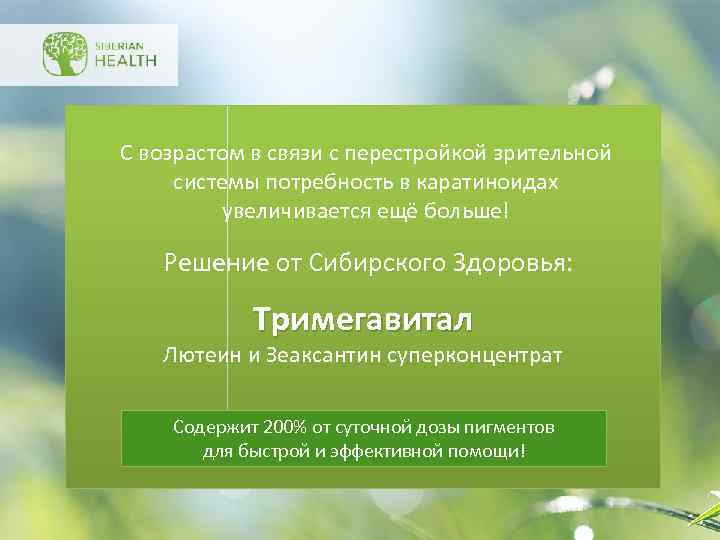 С возрастом в связи с перестройкой зрительной системы потребность в каратиноидах увеличивается ещё больше! Решение от Сибирского Здоровья: Тримегавитал Лютеин и Зеаксантин суперконцентрат Содержит 200% от суточной дозы пигментов для быстрой и эффективной помощи!