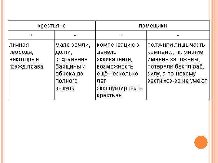 ГЛАВНЫЕ ПОЛОЖЕНИЯ КРЕСТЬЯНСКОЙ РЕФОРМЫ: Крестьяне освобождались с землей (одна десятина – 1 га) Приобретали гражданские права Свободные крестьяне создавали общины во главе с сельским старостой. Круговая порука. Общая земля. Общая выплата выкупа. Уставная грамота – договор между помещиком и крестьянином Мировые посредники – должностные лица, занимавшиеся утверждением уставных грамот и разбор споров. Временнообязанные крестьяне – лично свободные крестьяне, которые несли повинности в пользу крестьян до перехода на выкуп