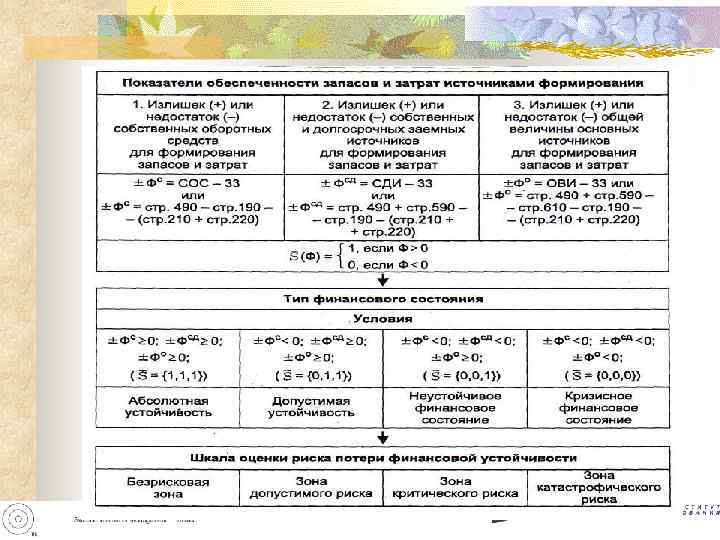 Безрисковая зона – состояние абсолютной финансовой устойчивости встречается довольно редко и характеризует такое положение, когда только собственные средства авансируются в оборотные активы. Зона допустимого риска – ситуация недостатка собственных оборотных средств и излишек долгосрочных источников формирования запасов и затрат. В крайнем случае – равенство этих величин. Ситуации соответствует гарантированная платежеспособность. Зона критического риска – ситуация сопряжена с нарушением платежеспособности, но сохраняется возможность восстановления равновесия в результате пополнения собственного капитала и увеличения собственных оборотных средств за счет привлечения займов и кредитов, сокращения дебиторской задолженности. Зона катастрофического риска – предприятие полностью зависит от заемных средств. Пополнение финансовых запасов идет за счет средств, образующихся в результате замедления погашения кредиторской задолженности.