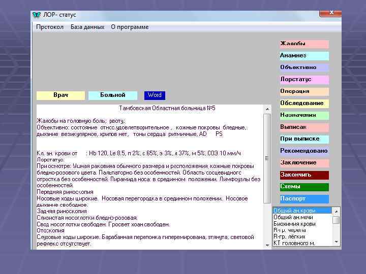 Программное обеспечение Лор-статус С помощью этой программы можно создавать мед. документацию, необходимую лор-врачу : эпикризы, осмотры, дневники. Появилась новая функция: составление слухового и вестибулярного паспорта, добавлены новые схемы. Преимущества: программа позволяет описывать жалобы больных, вести анамнез заболевания, указывать список препаратов, принимавшихся в качестве самолечения, наличие аллергических реакций и перенесенных болезней, вводить данные по обследованиям, назначениям, рекомендациям, заключениям, указывать информацию по выписанным больничным листам и т. д. Есть возможность вывода документов в текстовый редактор Word. Ведется статистика эпикризов. Поддерживается поиск по фамилии больного. Недостатки: мало пунктов заполнения, неудобен размер файла
