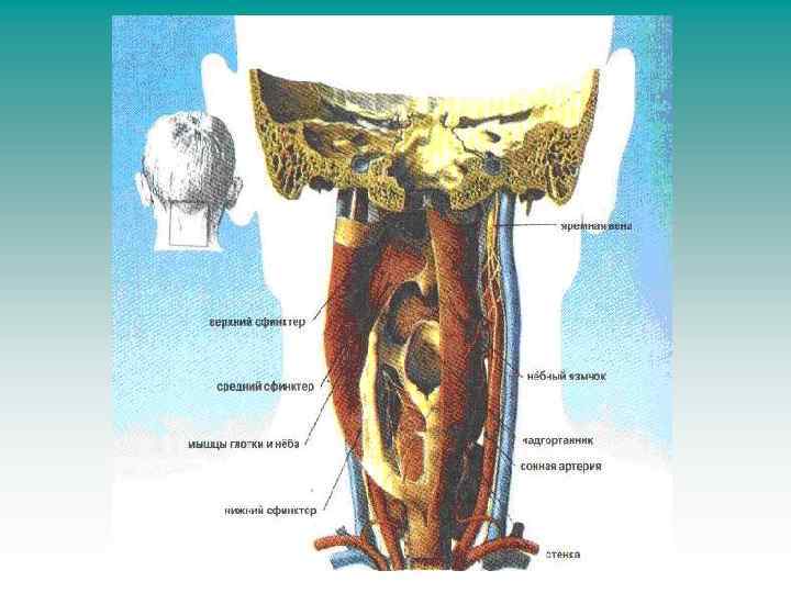 Поперечное сечение показывает верхние дыхательные пути: полости носа и рта, глотку, гортань, пищевод и трахею.