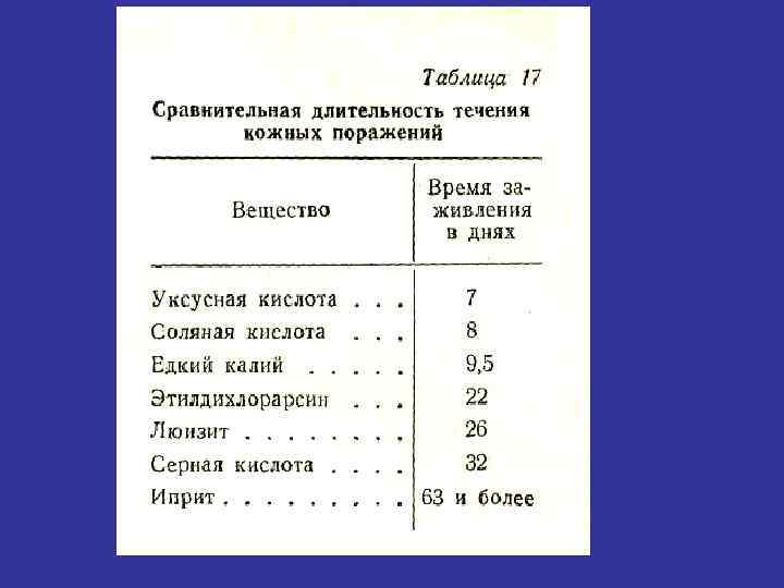 Действие паров иприта на человека Концентрация, мг/л Экспозиция Действие 0, 0005 (пар) 10 -25 мин Легкое раздражение глаз и кожи 0, 001 8 -9 час Возможен выход из строя 0, 0065 1 час Серьезные поражения легких 0, 07 30 мин Смертельное поражение Капельно-жидкий иприт 0, 01 мг/см 2 – эритема 0, 1 мг/см 2 – язвенное поражение