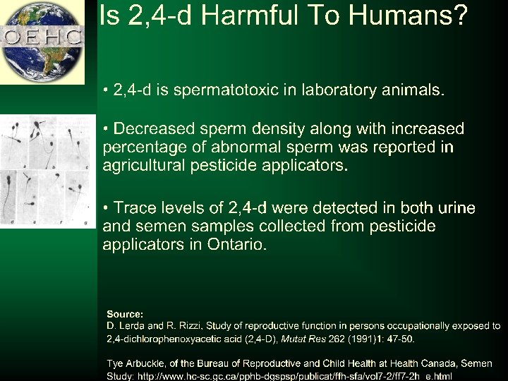 Is 2, 4 -d Harmful To Humans? • Long-term exposure can cause damage to the nervous system, kidneys and liver. • In MINNESOTA, farming regions (1996) areas with high 2, 4 -d use had higher incidence of birth defects compared with regions that had low use of 2, 4 -d • In 2005, California State lists the herbicide 2, 4 -D and related compounds as being developmental toxicants Source: Garry VF, Schreinemachers D, Harkins M, Griffith J. Pesticide appliers, biocides, and birth defects in rural Minnesota. Environ Health Perspectives 1996; 104(4): 394 -9. USEPA. Consumer factsheet on: 2, 4 -D. Available at http: //www. epa. gov/safewater/dwh/c-soc/24 -d. html. http: //www. oehha. ca. gov/prop 65/CRNR_notices/admin_listing/intent_to_list/NOILPkg 5 e. html