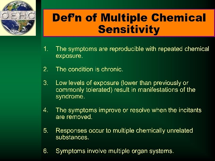 Multiple Chemical Sensitivities (MCS) Sept. 2003 study published in Environmental Health Perspectives (U. S. Department of Health and Human Services) found • 12. 6% of the population suffers from MCS • 1. 8% of population lost job as result of MCS Source: Environmental Health Perspectives: “More than 12% of Population Reports Extreme Sensitivity to Low Levels of Common Chemicals. ” September 11, 2003. http: //ehp. niehs. nih. gov/press/12 pop. html