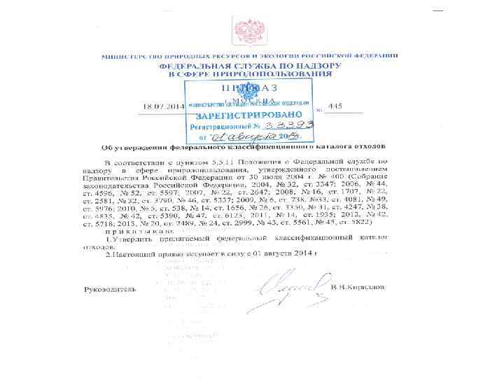 Нормирование в области обращения с отходами осуществляется в соответствии с Федеральным законом от 10 января 2002 года N 7 -ФЗ "Об охране окружающей среды" и Федеральным законом от 24 июня 1998 г. N 89 -ФЗ "Об отходах производства и потребления» Федеральный закон от 29 декабря 2014 г. N 458 -ФЗ "О внесении изменений в Федеральный закон "Об отходах производства и потребления", отдельные законодательные акты Российской Федерации и признании утратившими силу отдельных законодательных актов (положений законодательных актов) Российской Федерации" Принят Государственной Думой 23 декабря 2014 года Одобрен Советом Федерации 25 декабря 2014 года Настоящий Федеральный закон вступил с 1 января 2015 г. , за исключением положений, для которых статьей 24 установлены иные сроки вступления их в силу.