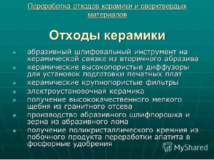 Керамические отходы Кера мика — изделия из неорганических материалов (например, глины) и их смесей с минеральными добавками, изготавливаемые под воздействием высокой температуры с последующим охлаждением Вторичное применение отходов от сноса кирпичных зданий Щебень из глиняных кирпичей может быть использован как подсыпка при выравнивании поверхностей и как заполнитель дренажных систем. Измельченный материал может заменить натуральные материалы, такие как песок. Кирпичные отходы сноса зданий и сооружений на протяжении многих лет используются для засыпки и выравнивания дорог Щебень глиняного кирпича, черепицы и другие отходы кладки могут быть использован при крупных проектах дорожного строительства, особенно в условиях дефицита натуральных материалов.