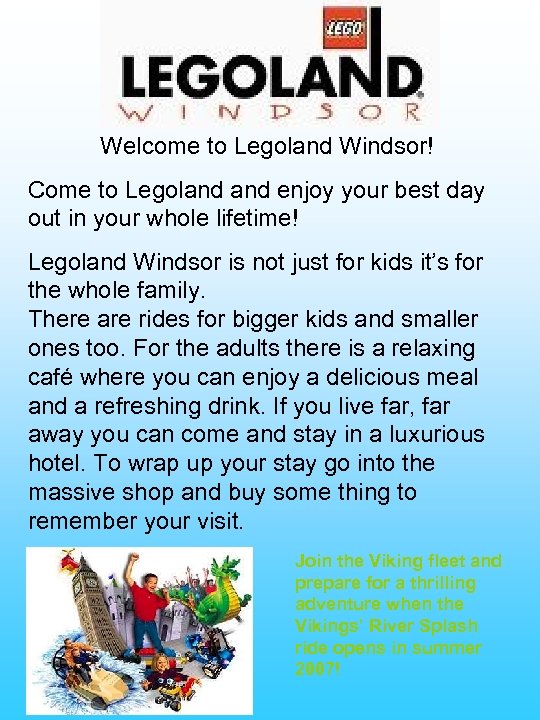 Welcome to Legoland Windsor! Come to Legoland enjoy your best day out in your whole lifetime! Legoland Windsor is not just for kids it’s for the whole family. There are rides for bigger kids and smaller ones too. For the adults there is a relaxing café where you can enjoy a delicious meal and a refreshing drink. If you live far, far away you can come and stay in a luxurious hotel. To wrap up your stay go into the massive shop and buy some thing to remember your visit. Join the Viking fleet and prepare for a thrilling adventure when the Vikings’ River Splash ride opens in summer 2007!