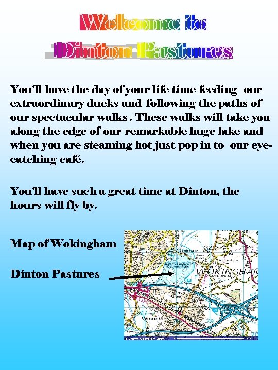 You’ll have the day of your life time feeding our extraordinary ducks and following the paths of our spectacular walks. These walks will take you along the edge of our remarkable huge lake and when you are steaming hot just pop in to our eyecatching café. You’ll have such a great time at Dinton, the hours will fly by. Map of Wokingham Dinton Pastures