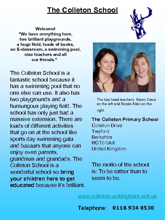 The Colleton School Welcome! "We have everything here, two brilliant playgrounds, a huge field, loads of books, an E-classroom, a swimming pool, nice teachers and all our friends. " The Colleton School is a fantastic school because it has a swimming pool that no one else can use. It also has two playgrounds and a humungous playing field. The school has only just had a massive extension. There are loads of different activities that go on at the school like sports day swimming gala and bazaars that anyone can enjoy even parents, grandmas and grandads. The Colleton School is a wonderful school so bring your children here to get educated because it’s brilliant. The two head teachers. Karen Davis on the left and Nicola Allan on the right. The Colleton Primary School Colleton Drive Twyford Berkshire RG 10 0 AX United Kingdom The motto of the school is: To be rather than to seem to be. www. colleton. wokingham. sch. uk Telephone: 0118 934 0530