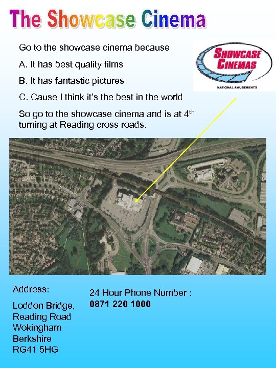 Go to the showcase cinema because A. It has best quality films B. It has fantastic pictures C. Cause I think it’s the best in the world So go to the showcase cinema and is at 4 th turning at Reading cross roads. Address: 24 Hour Phone Number : 0871 220 1000 Loddon Bridge, Reading Road Wokingham Berkshire RG 41 5 HG