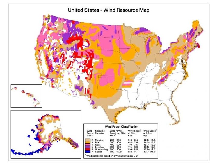 Wind Power • The problem is that the wind fluctuates on all time scales: – – – Seasonally (highest in springtime, next in summer) Varies with weather Day – night switch in direction between ocean and desert in California Dies out around sunset when peak power is needed High velocity gusts are much more efficient than average wind Wind velocity range of 12 to 30 mph • Average wind power is only 1/3 of the maximum capacity that the turbine is built for • Tall is better: a 3 megawatt Vesta V 90, has a 70 m tower, with 90 m diameter rotor. • If built in an 18 m ocean depth, it goes down another 30 m into the seabed. • Spacing needed is 3 -5 times diameter side to side, and 5 -10 times diameter in depth.