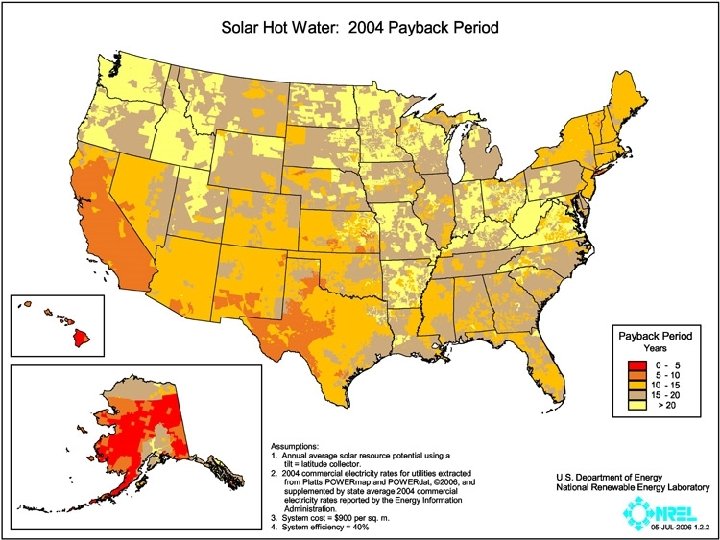 Grand Solar Plan for 2100 Scientific American, January 2008 Ken Zweibel (NREL), James Mason, Vasilis Fthenakis (BNL) • Almost all of US power to be generated by solar plants in the Southwest. – Allows for 1% yearly growth in total power, to 2. 5 times current usage by 2100 – Meets 90% of transportation with hydrogen (why not electric? ) – Reduces CO 2 emissions 92% below 2005 levels • Total of 12. 7 Terawatts solar power (1 TW = 1, 000 Gigawatts) – 5. 2 TW direct solar power (2. 9 TW is PV, 2. 3 TW is concentrated) – 7. 5 TW solar power through DC power lines to local compressed air plants for 24 hour power retrieval • Extra power sources – – • 1. 3 TW distributed PV 1 TW wind farms 0. 2 TW geothermal power, 0. 5 TW geothermal water heating 0. 25 TW biofuels Uses 165, 000 square miles of PV and concentrated solar power plants. Coincidentally, this is the area of California. Needs only $420 billion in subsidies to start up. The rest from utility payments.