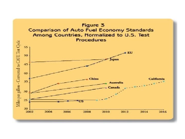 US, California and World Fuel Economy Standards • The US plan has specific improvements targeted for inclusion such as cylinder deactivation (6% savings), variable valve timing (2 -14%), and turbocharging which can reduce engine size by 30%. • The cost of the improvements would be repaid more than doubly in gas savings over a ten year period. • US plan in 2020 is 35 mpg average. • California’s GHG emissions standards would rise faster than the US new plan. • CA (44 mpg average in 2020) would save 74% more emissions than US (35 mpg). • Inclusively, CA plan would save double (or 69%) of the emissions by 2020. • Europeans use 1/6 the gas of Americans due to public transport, city structure, smaller cars, motorcycles, bikes, and walking. • Half of European trips use public transport or walking.