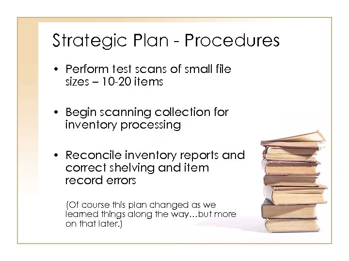Strategic Plan - Procedures • Perform test scans of small file sizes – 10 -20 items • Begin scanning collection for inventory processing • Reconcile inventory reports and correct shelving and item record errors (Of course this plan changed as we learned things along the way…but more on that later. )