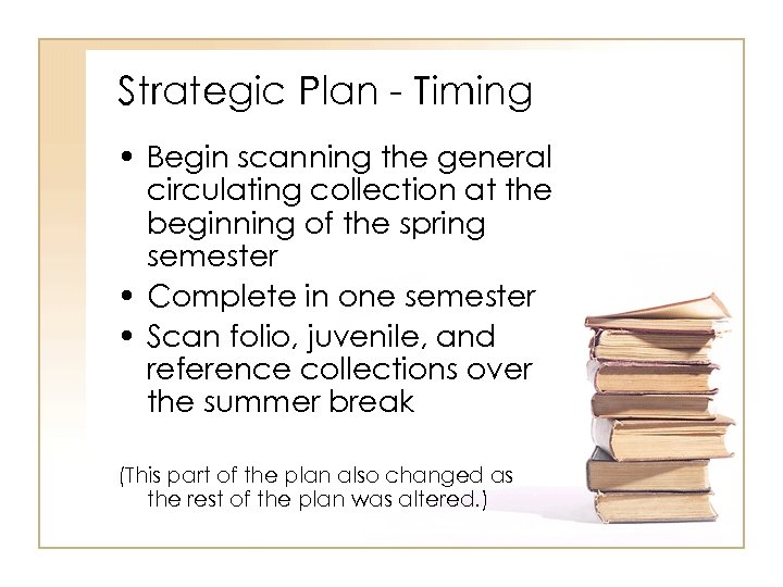 Strategic Plan - Timing • Begin scanning the general circulating collection at the beginning of the spring semester • Complete in one semester • Scan folio, juvenile, and reference collections over the summer break (This part of the plan also changed as the rest of the plan was altered. )
