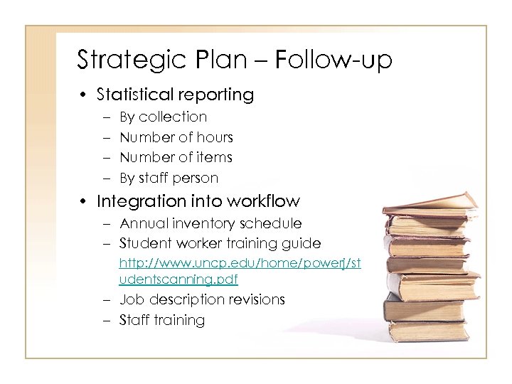 Strategic Plan – Follow-up • Statistical reporting – – By collection Number of hours Number of items By staff person • Integration into workflow – Annual inventory schedule – Student worker training guide http: //www. uncp. edu/home/powerj/st udentscanning. pdf – Job description revisions – Staff training