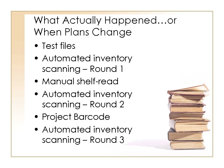 What Actually Happened…or When Plans Change • Test files • Automated inventory scanning – Round 1 • Manual shelf-read • Automated inventory scanning – Round 2 • Project Barcode • Automated inventory scanning – Round 3