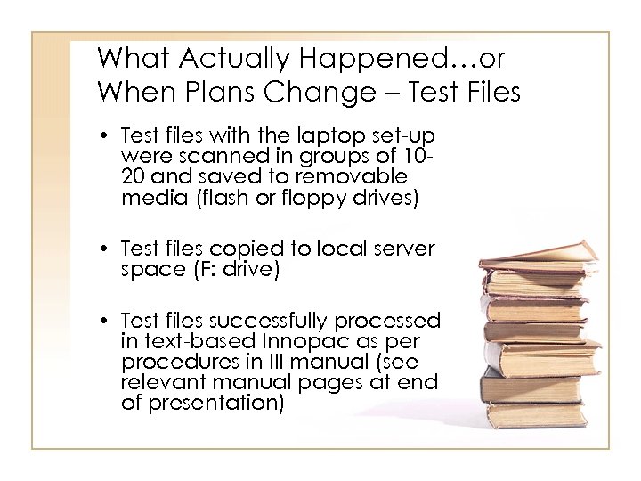 What Actually Happened…or When Plans Change – Test Files • Test files with the laptop set-up were scanned in groups of 1020 and saved to removable media (flash or floppy drives) • Test files copied to local server space (F: drive) • Test files successfully processed in text-based Innopac as per procedures in III manual (see relevant manual pages at end of presentation)