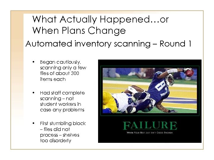 What Actually Happened…or When Plans Change Automated inventory scanning – Round 1 • Began cautiously, scanning only a few files of about 300 items each • Had staff complete scanning – not student workers in case any problems • First stumbling block – files did not process – shelves too disorderly