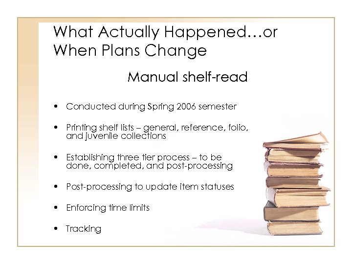What Actually Happened…or When Plans Change Manual shelf-read • Conducted during Spring 2006 semester • Printing shelf lists – general, reference, folio, and juvenile collections • Establishing three tier process – to be done, completed, and post-processing • Post-processing to update item statuses • Enforcing time limits • Tracking