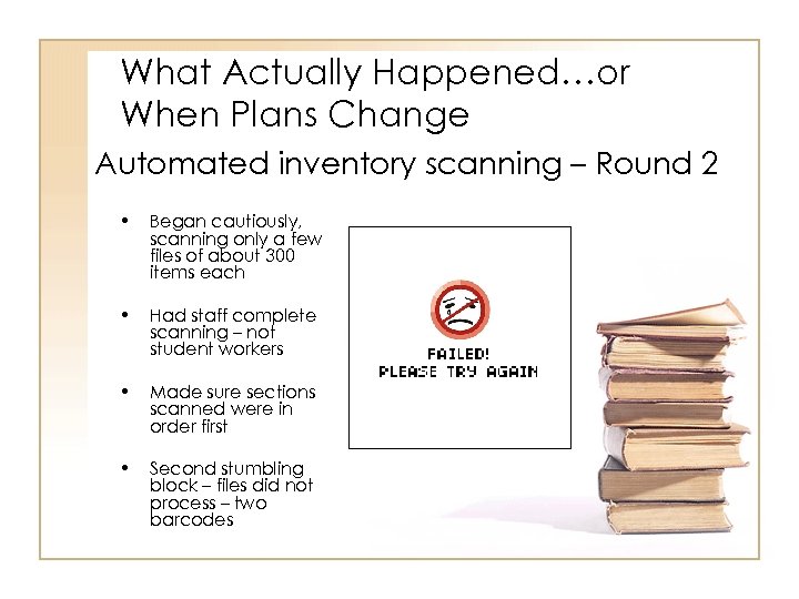 What Actually Happened…or When Plans Change Automated inventory scanning – Round 2 • Began cautiously, scanning only a few files of about 300 items each • Had staff complete scanning – not student workers • Made sure sections scanned were in order first • Second stumbling block – files did not process – two barcodes