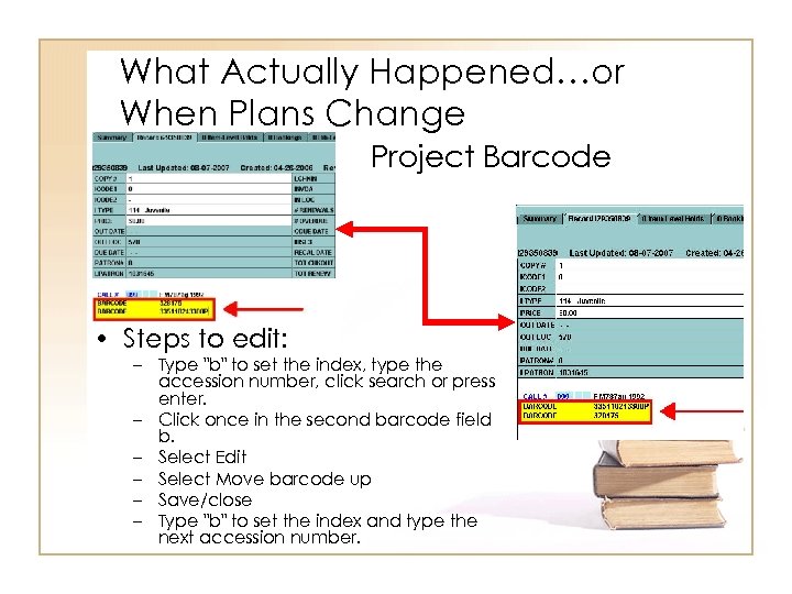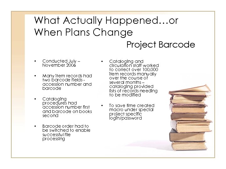 What Actually Happened…or When Plans Change Project Barcode • Conducted July – November 2006 • Many item records had two barcode fields accession number and barcode • Cataloging procedures had accession number first and barcode on books second • Barcode order had to be switched to enable successful file processing • Cataloging and circulation staff worked to correct over 100, 000 item records manually over the course of several months – cataloging provided lists of records needing to be modified • To save time created macro under special project specific login/password