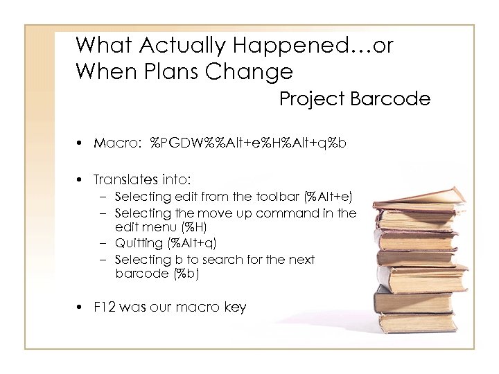 What Actually Happened…or When Plans Change Project Barcode • Macro: %PGDW%%Alt+e%H%Alt+q%b • Translates into: – Selecting edit from the toolbar (%Alt+e) – Selecting the move up command in the edit menu (%H) – Quitting (%Alt+q) – Selecting b to search for the next barcode (%b) • F 12 was our macro key