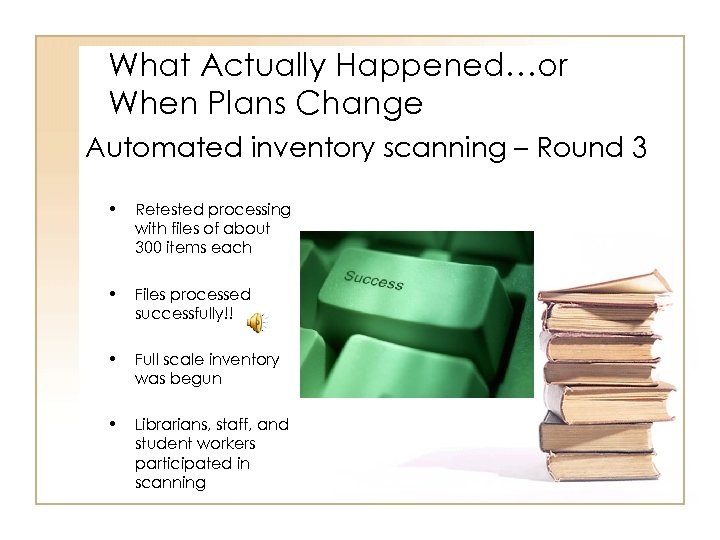 What Actually Happened…or When Plans Change Automated inventory scanning – Round 3 • Retested processing with files of about 300 items each • Files processed successfully!! • Full scale inventory was begun • Librarians, staff, and student workers participated in scanning