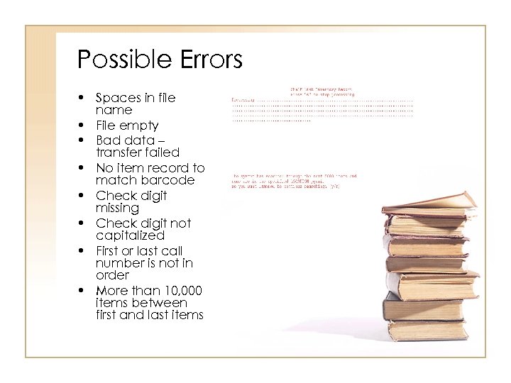 Possible Errors • Spaces in file name • File empty • Bad data – transfer failed • No item record to match barcode • Check digit missing • Check digit not capitalized • First or last call number is not in order • More than 10, 000 items between first and last items