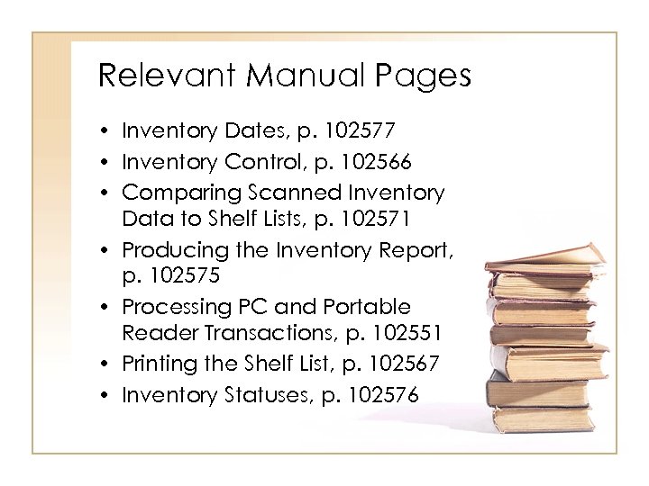 Relevant Manual Pages • Inventory Dates, p. 102577 • Inventory Control, p. 102566 • Comparing Scanned Inventory Data to Shelf Lists, p. 102571 • Producing the Inventory Report, p. 102575 • Processing PC and Portable Reader Transactions, p. 102551 • Printing the Shelf List, p. 102567 • Inventory Statuses, p. 102576