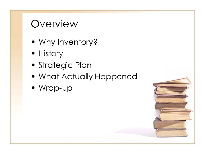 Overview • • • Why Inventory? History Strategic Plan What Actually Happened Wrap-up