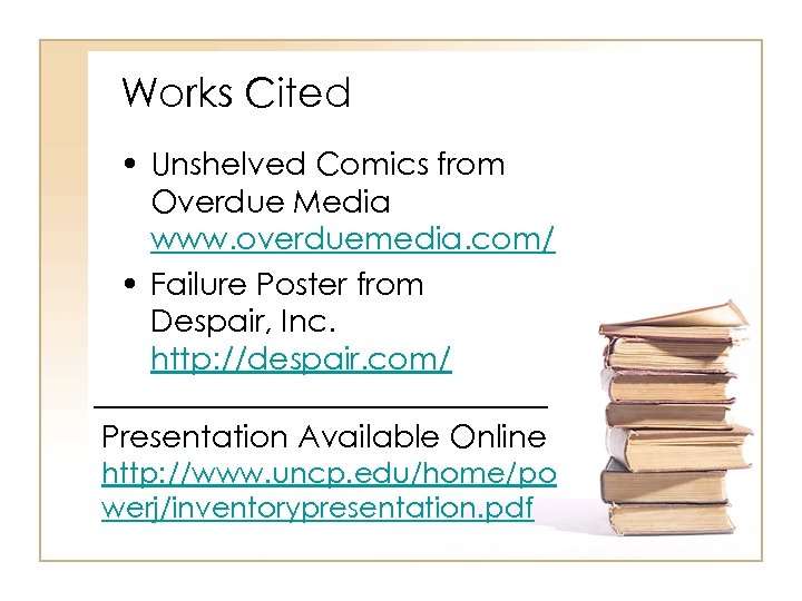 Works Cited • Unshelved Comics from Overdue Media www. overduemedia. com/ • Failure Poster from Despair, Inc. http: //despair. com/ Presentation Available Online http: //www. uncp. edu/home/po werj/inventorypresentation. pdf