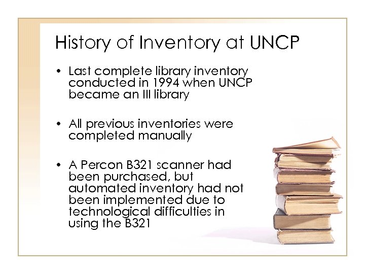 History of Inventory at UNCP • Last complete library inventory conducted in 1994 when UNCP became an III library • All previous inventories were completed manually • A Percon B 321 scanner had been purchased, but automated inventory had not been implemented due to technological difficulties in using the B 321
