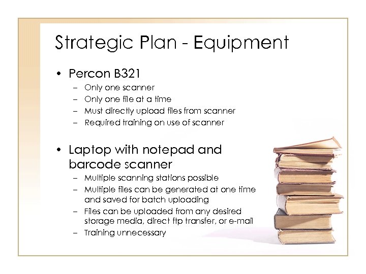 Strategic Plan - Equipment • Percon B 321 – – Only one scanner Only one file at a time Must directly upload files from scanner Required training on use of scanner • Laptop with notepad and barcode scanner – Multiple scanning stations possible – Multiple files can be generated at one time and saved for batch uploading – Files can be uploaded from any desired storage media, direct ftp transfer, or e-mail – Training unnecessary